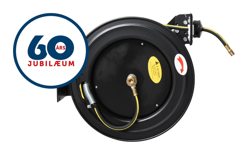 Automatisk slangeopruller i kraftigt åbent, pulverlakeret metalkabinet. Monteret med 15 mtr. 3/8" flextrykluftslange med temperaturområde -40 gr.C til 60 gr.C. Leveres med fast vægbeslag.